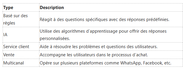 Il existe principalement deux types de chatbots: les chatbots basés sur des règles et ceux alimentés par l'IA. Les premiers suivent des scripts prédéfinis et réagissent à des phrases spécifiques, tandis que les seconds utilisent des modèles d'apprentissage machine pour fournir des réponses plus contextuelles et variées.