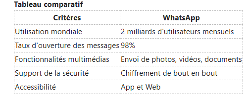 Les fonctionnalités multimédias de WhatsApp vous permettent de transmettre des informations sous diverses formes, qu'il s'agisse de textes, d'images, ou de vidéos. Cette diversité rend vos interactions plus attrayantes et dynamiques, vous permettant de capter l'attention de vos clients d'une manière qui n'est pas toujours possible sur d'autres plateformes.