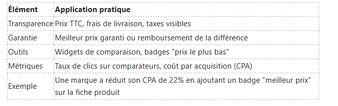 Vous verrez que ces consommateurs comparent en moyenne 3 à 5 sources avant de décider; ils sont sensibles aux frais de livraison et aux garanties de prix. Pour les attirer, affichez clairement la politique de prix, proposez un comparateur interne et utilisez les flux sur les marketplaces et comparateurs externes.