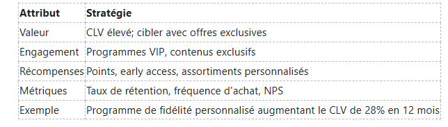 Vous pouvez segmenter vos fidèles par valeur à vie (CLV) et proposer des expériences exclusives: événements, remises cumulatives et invitations VIP augmentent la fréquence d'achat et la recommandation. Mesurez NPS, taux de réachat et CLV pour prioriser les actions.