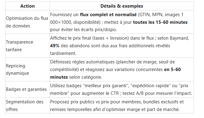Adoptez une stratégie de repricing fondée sur des règles : définissez un plancher de marge (par exemple 5-10 % selon produit), un taux de réactivité (mise à jour toutes les 10-30 minutes pour les best-sellers) et des exceptions pour articles à marge stratégique. Vous pouvez coupler cela à un algorithme de surveillance qui compare vos prix à ceux de 5 concurrents clés et ajuste automatiquement dans une fourchette prédéfinie.
