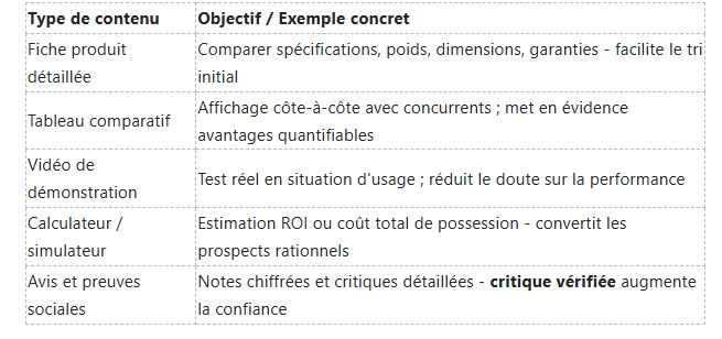 Vous fournissez des informations factuelles, comparatives et vérifiables : tableaux techniques, fiches produit complètes, études de cas chiffrées et vidéos de test. Les acheteurs comparateurs cherchent des preuves tangibles et des chiffres clairs ; proposez des comparatifs côte-à-côte et des benchmarks pour faciliter la décision.