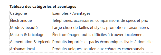 Vous pouvez faire vos achats à tout moment depuis votre smartphone ou ordinateur, ce qui évite les déplacements dans la circulation dense de Douala ou Yaoundé et vous fait gagner un temps précieux; 24/7 et la possibilité de choisir livraison à domicile ou point relais facilitent fortement la vie quotidienne.
