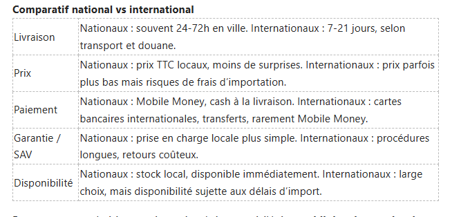 Les acteurs nationaux vous offrent généralement une livraison plus rapide, des modes de paiement locaux (Mobile Money, cash à la livraison) et un service client en français ou anglais accessible localement ; les sites internationaux élargissent l’offre mais introduisent souvent des délais d’acheminement de 7 à 21 jours et des frais d’importation. Vous devez peser le gain de prix contre les coûts cachés liés aux taxes et aux retours.