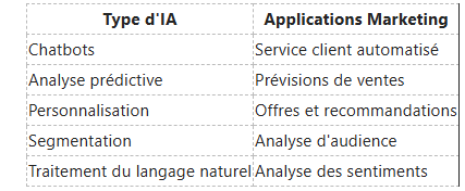Dans le domaine du marketing, plusieurs types d'intelligence artificielle jouent un rôle majeur. Des chatbots aux recommandations personnalisées, chaque outil utilise des algorithmes avancés pour optimiser l'expérience client. Les systèmes de recommandation, par exemple, analysent le comportement des utilisateurs pour fournir des suggestions pertinentes.