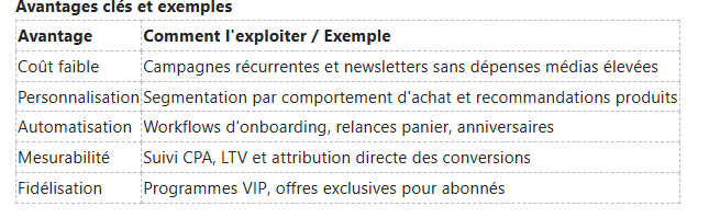 Vous pouvez tirer parti d'un canal à faible coût et hautement mesurable : l'e-mail offre un retour sur investissement souvent supérieur aux canaux payants, permet de suivre précisément ouverture, clics et conversions, et facilite la personnalisation à grande échelle via la segmentation. Grâce aux automatisations (workflows d'onboarding, relances panier, séries de réengagement), vous maintenez le contact avec vos clients sans coûts proportionnels à la taille de votre audience.