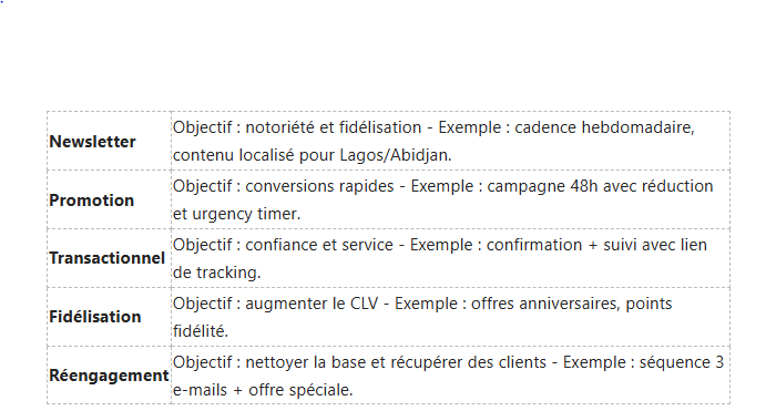 De plus, localisez le ton et les visuels : adaptez la langue (français, anglais, swahili, haoussa, amharique), les références culturelles et les promotions liées aux fêtes locales. N'oubliez pas l'optimisation mobile et les modèles légers pour les zones à faible bande passante - un message lourd peut transformer un prospect en désabonné.