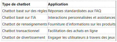 Il existe plusieurs types de chatbots, chacun ayant des applications spécifiques. Les chatbots basés sur des règles suivent des scénarios prédéterminés, tandis que les chatbots basés sur l'IA utilisent des technologies avancées pour comprendre et générer des réponses. Par exemple, les chatbots peuvent être utilisés pour gérer le service client, automatiser les rendez-vous, ou même effectuer des ventes.