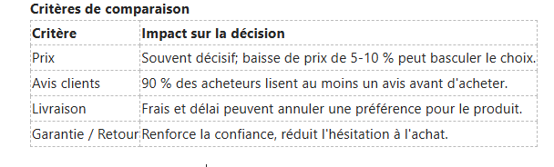 Vous constatez que ces consommateurs passent par plusieurs sites, comparent prix, frais de livraison et avis avant d'acheter ; pour beaucoup, le prix et les frais de livraison représentent jusqu'à 60 % de la décision finale. Il est donc essentiel de proposer des prix compétitifs, une politique de livraison claire et des éléments de différenciation (garantie, emballage, service client).