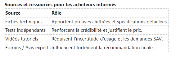 Vous remarquez que ces consommateurs collectent des informations détaillées : fiches techniques, tests comparatifs, vidéos et forums spécialisés ; ils privilégient la qualité et la durabilité plutôt que le simple prix. Pour les attirer, fournissez des contenus approfondis (PDF techniques, vidéos de démonstration, études de cas) et des preuves chiffrées (performances, certifications).