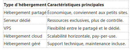 Lorsque vous choisissez un hébergement pour votre site, il est essentiel de comprendre les différents types d'hébergement web disponibles. Cela inclut l'hébergement partagé, où plusieurs sites partagent un seul serveur, et les solutions plus avancées comme les serveurs dédiés, qui offrent des ressources exclusives à un seul utilisateur. Vous pourriez également considérer l'hébergement VPS (Virtual Private Server), qui combine les avantages de l'hébergement partagé et dédié.