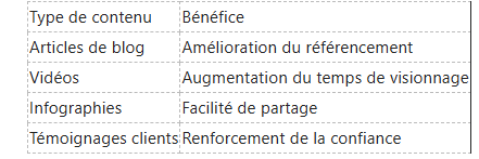 La diversité des formats de contenu joue un rôle essentiel dans l'engagement de votre audience. Parmi les types de contenu les plus efficaces, on trouve les articles de blog, les vidéos, les infographies, les témoignages clients, et les posts sur les réseaux sociaux. Chacun de ces formats permet de présenter des informations de manière dynamique et captivante. Pour illustrer cela, une étude a révélé que les articles enrichis de visuels génèrent jusqu'à 94% d'engagement supplémentaire.