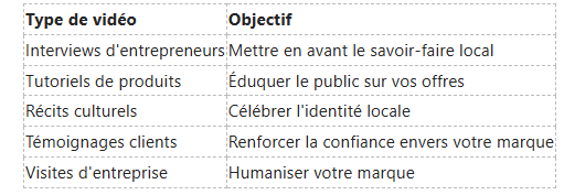 Créer des vidéos adaptées à votre audience locale peut renforcer votre connexion avec la communauté. Plusieurs types de vidéos peuvent être efficaces, telles que des interviews d'entrepreneurs locaux, des tutoriels sur des produits locaux, ou encore des récits sur des événements culturels. Ces formats permettent de mettre en avant ce qui rend votre région unique tout en engageant votre clientèle.