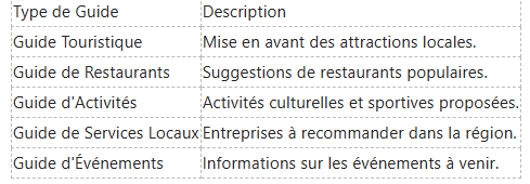 Vous pouvez aussi envisager des guides de services locaux qui mettent en avant des entreprises partenaires ou des spécialités locales, comme les artisans et producteurs. Chaque guide doit être bien structuré et visuellement attractif pour capter l’attention des lecteurs. Assume that ces guides seront partagés sur différentes plateformes, augmentant ainsi votre visibilité.