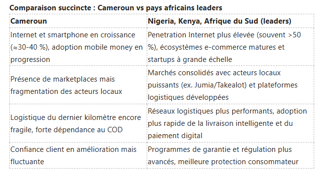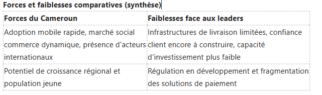 Vous voyez donc que, comparé aux leaders africains, le Cameroun affiche des atouts technologiques (mobile money, social commerce) mais souffre encore de goulots logistiques et d'une régulation moins mature, ce qui limite la montée en puissance d'acteurs locaux à grande échelle.