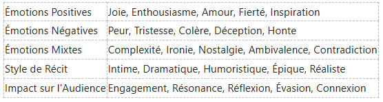 En somme, vous devez combiner ces éléments de manière réfléchie pour créer une histoire cohérente qui capte l'attention et stimule les émotions de votre public.