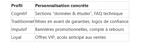 - Personnaliser le message et le canal : offres limitées pour les impulsifs, comparatifs clairs pour les comparateurs, récompenses pour les fidèles.