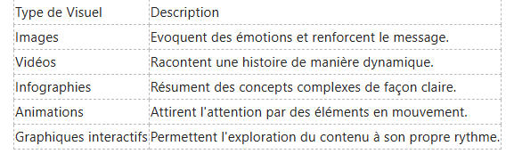 Il existe plusieurs types de visuels que vous pouvez utiliser pour enrichir votre storytelling digital. Les images, les vidéos et les infographies sont quelques exemples parmi d'autres. Chacun de ces formats apporte une valeur ajoutée différente. Les photos peuvent évoquer des émotions, tandis que les vidéos peuvent raconter une histoire de manière dynamique et immersive.
