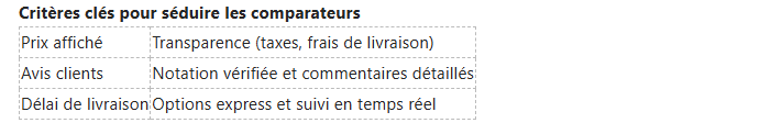 Plus d'information : offrez des outils de comparaison intégrés, des garanties de prix (match) et des pages produit avec données structurées (schema.org) pour améliorer votre visibilité sur les moteurs et convaincre les acheteurs méthodiques.