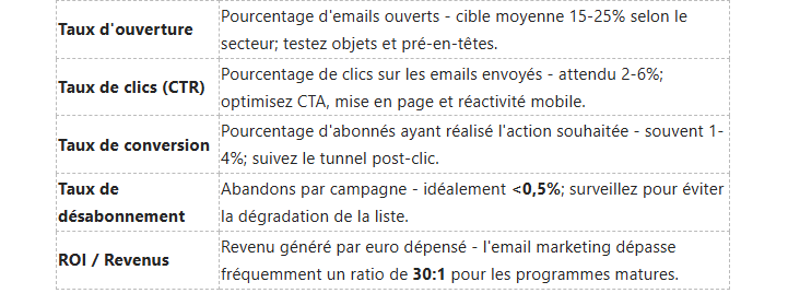 - ROI, délivrabilité et taux de rebond : combinent performance financière et capacité à atteindre la boîte de réception; suivre pour optimiser revenus et réputation d'envoi.