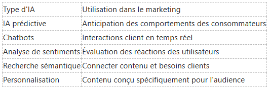 A: Grâce à l'analyse de grandes quantités de données, l'IA identifie les comportements et les tendances des utilisateurs, permettant aux marketeurs d'adapter leur contenu aux besoins spécifiques de leur audience.