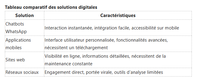 Les sites web bénéficient d'une visibilité accrue et de la possibilité d'héberger une multitude d'informations. Cependant, leur complexité peut entraîner des coûts de maintenance élevés et compliquer l'interaction des utilisateurs. En revanche, les chatbots WhatsApp se distinguent par leur simplicité d'utilisation et leur intégration facile dans les communications quotidiennes des entreprises.